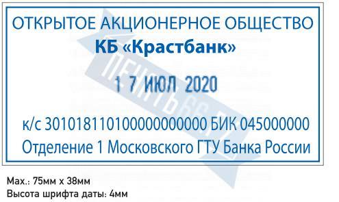 Поле: 75 х 38 мм, высота даты: 4 мм. Со встроенной окрашенной штемпельной подушкой синего цвета.
