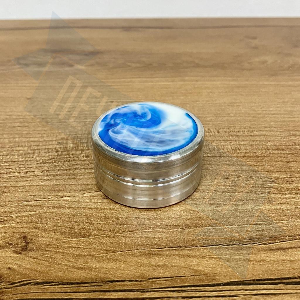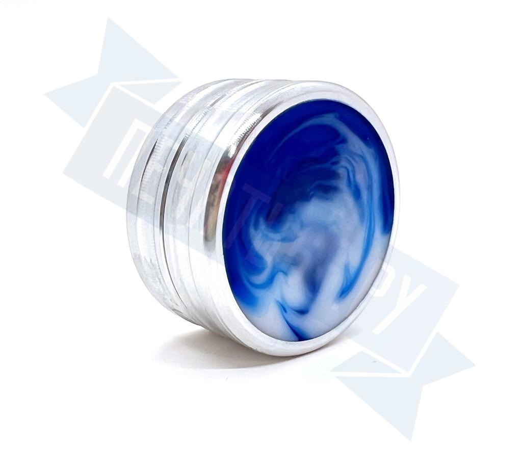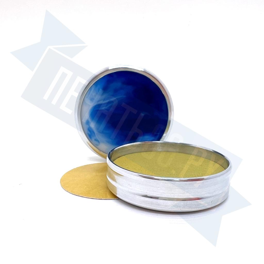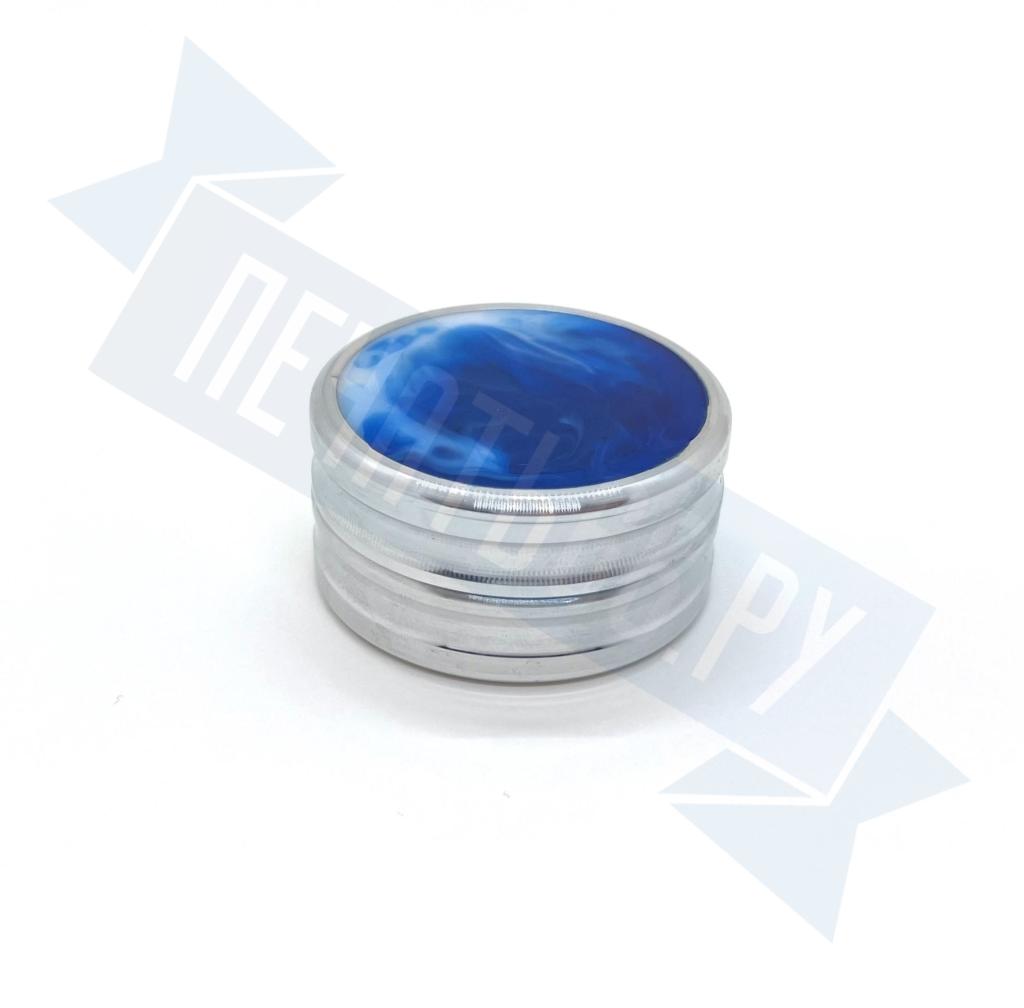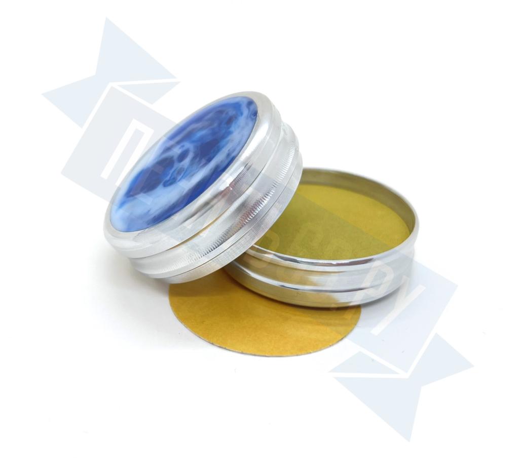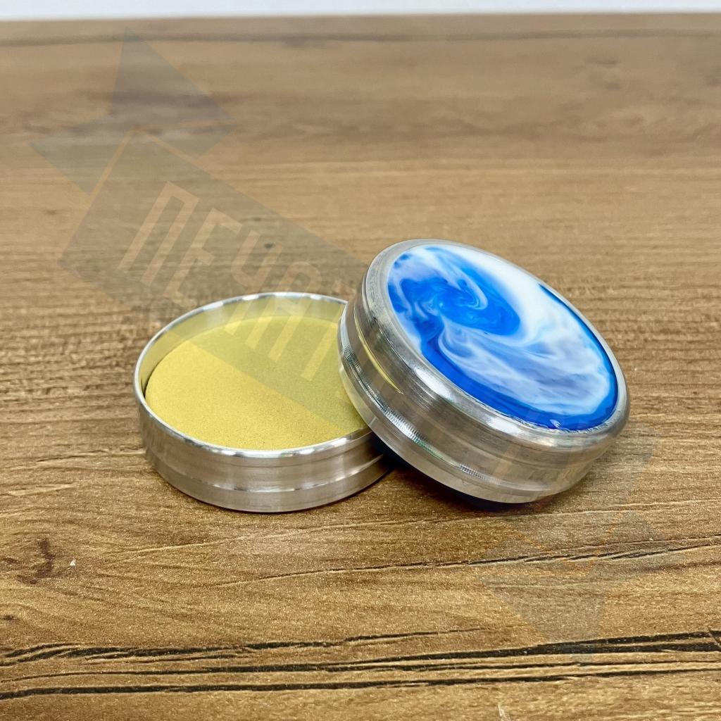 Металлическая оснастка для круглой печати со встроенной неокрашенной штемпельной подушкой. Благодаря встроенному магниту, крышку не нужно закручивать. В качестве декора на крышке и корпусе оснастки использованы вставки из акрила