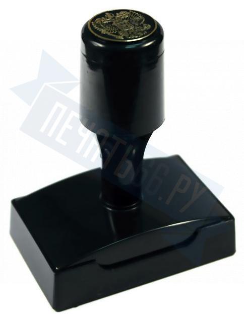Ручная пластмассовая оснастка с крышкой для печати, штампа, факсимиле имеет клеевой слой для крепления клише печати.
